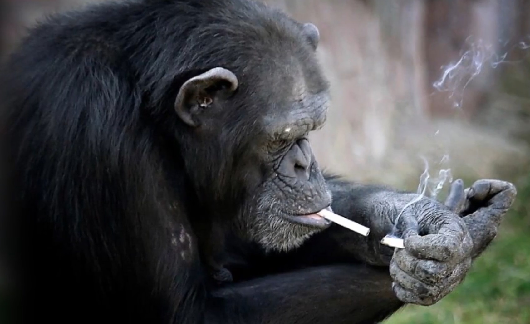 Dans l’une d’elle, un spectateur parvient à lancer une cigarette qui atterrit auprès d’un singe. L’animal récupère la clope, et se met à fumer le plus naturellement du monde, avant de se réjouir et d’inviter un de ses congénères à venir essayer.